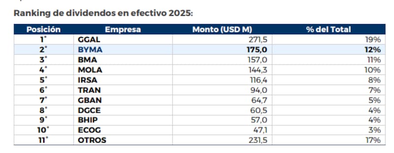 El ranking empresarial muestra, además, dónde estuvo el pulso principal del mercado. Grupo Financiero Galicia fue la compañía que más dividendos repartió, con u$s 271,5 millones. BYMA se ubicó en segundo lugar con u$s 175 millones, seguida por Banco Macro con u$s 157 millones, Molinos Agro con u$s 144,3 millones e IRSA con u$s 116,4 millones.
