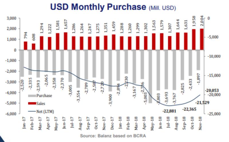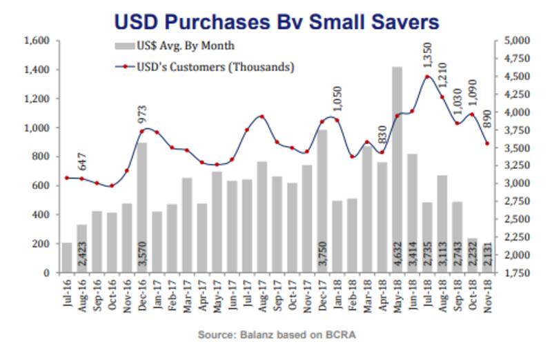 Uno de los factores clave que generaron un mayor desequilibrio en el mercado cambiario fue el proceso de dolarización de carteras en el mercado local, producto de la dispara del dólar, del aumento de las expectativas de devaluación y de inflación. La demanda de dólares se disparó en línea con la cantidad de participantes minoristas en el mercado cambiario. Ahora bien, en noviembre, las compras netas en dólares se volvieron positivas por un monto de u$s 107.5 millones.