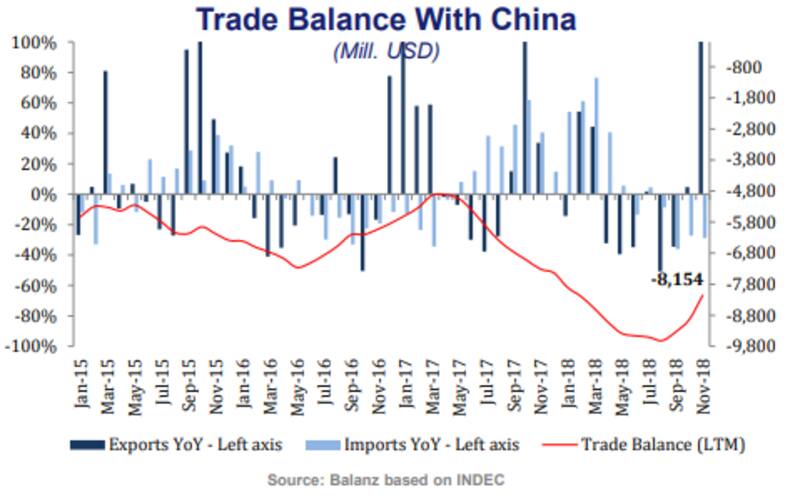“En octubre y noviembre, las exportaciones de Argentina a China aumentaron 4,6% y 197.3% interanual, respectivamente. Mientras que, las importaciones crecieron 2,6% en el año, dejando un déficit hasta noviembre de u$s 8.150millones