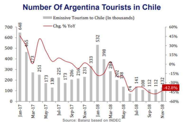 Un ejemplo claro es la evolución de la cantidad de turistas a Chile. “Hasta noviembre de 2018, el número de turistas argentinos en Chile cayó 25,3% interanual y en los últimos 3 meses, el turismo saliente hacia Chile ha caído un 45,6%, -37,6% y -42,8% interanual en septiembre, octubre y noviembre respectivamente .