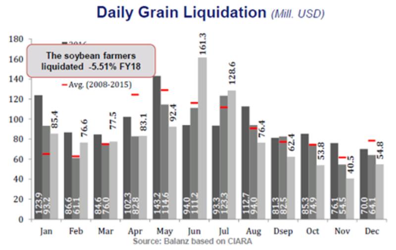 Como parte de su análisis, desde Balanz comentaron que durante diciembre, los productores de soja liquidaron 9,82% menos por día, en comparación con el mismo mes de 2017, mientras que en noviembre las ventas cayeron 38,06% interanual.
