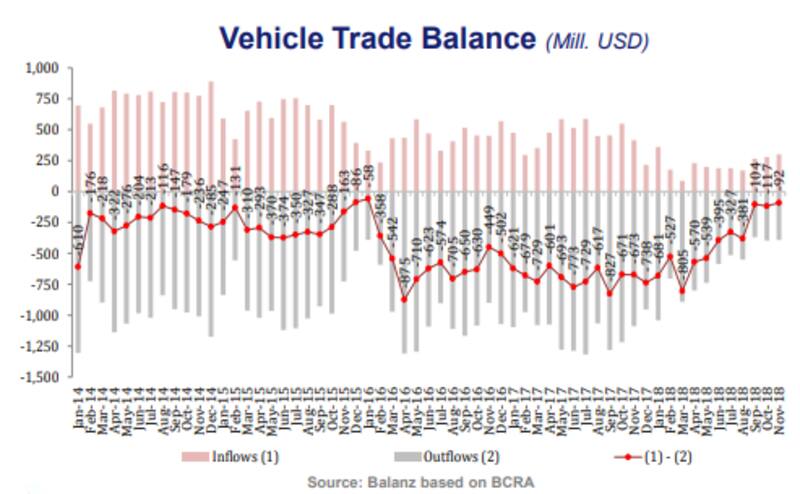 “En los últimos meses, las ventas a los concesionarios de automóviles cayeron 50% en octubre, 57,9% en noviembre y 46,4% en diciembre. Por su parte, las exportaciones han crecido 4%, 36,2% y 26,1% en los meses de octubre, noviembre y diciembre, respectivamente , comentaron en su informe los analistas de Balanz.