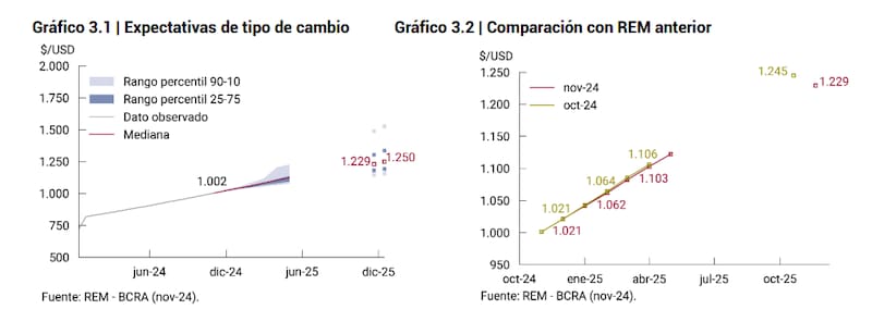 Para diciembre de 2025, el conjunto de analistas pronostica un tipo de cambio nominal de $ 1.250 por dólar. De este modo, la variación interanual implícita se ubicó en 59,1% a diciembre 2024 y a 22,3% en diciembre 2025.