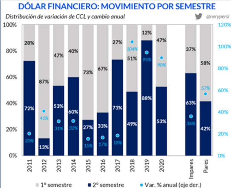 Mas allá de las probabilidades de ocurrencia de que el dólar opere por encima o por debajo de la barrera psicológica de los $ 200, lo que suele ser una constante es que, en la mayoría de los años, el dólar contado con liquidación suele evidenciar sus mayores movimientos en la segunda parte del año, es decir, en el segundo semestre.