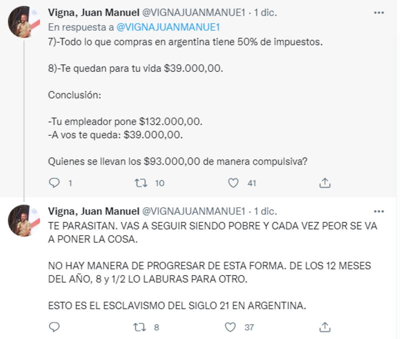 "Te parasitan. Vas a seguir siendo pobre y cada vez peor se va a poner la cosa. No hay manera de progresar de esta forma. De los 12 meses del año, 8 y 1/1 lo laburas para otro. Esto es el esclavismo del siglo 21 en Argentina", apuntó Juan Manuel Vigna, autor del posteo original.