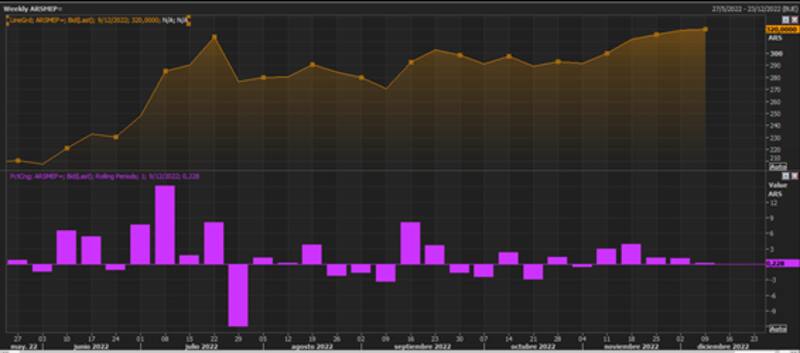 Mientras la deuda subía, el dólar también se despertó. El dólar MEP pasó de $280 a $329 desde octubre a la fecha y acumula 5 semanas seguidas de subas, lo cual lo depositó en zona de máximos históricos nuevamente.
