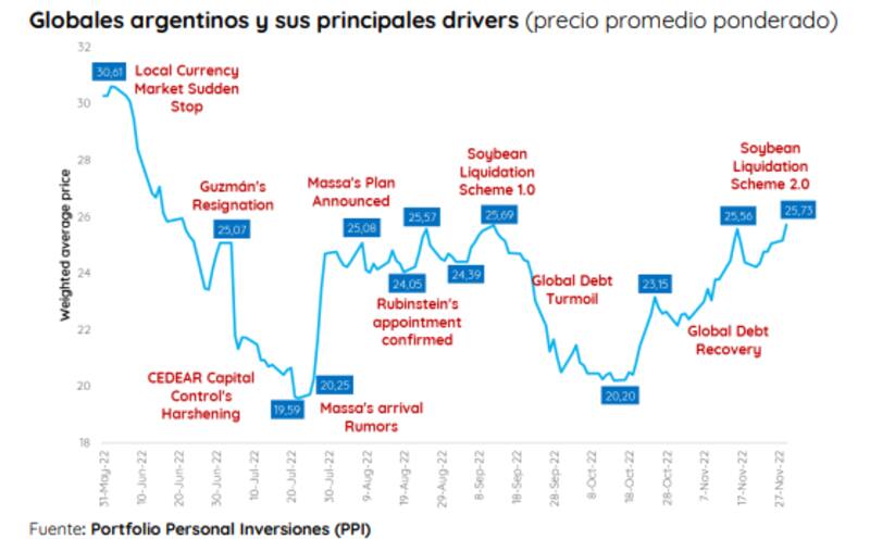 "El nuevo esquema de liquidación diferenciada para sojeros ayudará a que ingresen al menos u$s 2000 millones en diciembre, lo cual fortalece la probabilidad de pago de los dos cupones en 2023 (u$s 2100 millones). También será fundamental cómo continúa la dinámica inflacionaria en Estados Unidos, y por consecuencia, el tono de la Reserva Federal en su última reunión a mediados de mes", dijo.