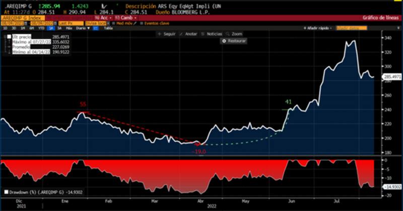 En el último rally hacia los $ 340, dicha relación había mostrado una situación de estrés alcista y con el actual ajuste, hoy la misma comienza a mostrar la señal opuesta.