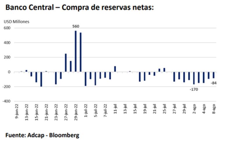 "En la última semana el BCRA terminó con ventas netas por u$s 691 millones y acumula casi u$s 2000 millones de ventas desde los primeros días de julio. La liquidación del agro repuntó a u$s 780 millones, 25% más que la semana previa, y se mantiene en línea con lo ocurrido en agosto del año pasado. Esto, sumado a los pagos de intereses al FMI por u$s 420 millones, determinó una caída de u$s 1021 millones en las reservas. Las netas quedaron en u$s 1220 millones la semana pasada", dijeron.