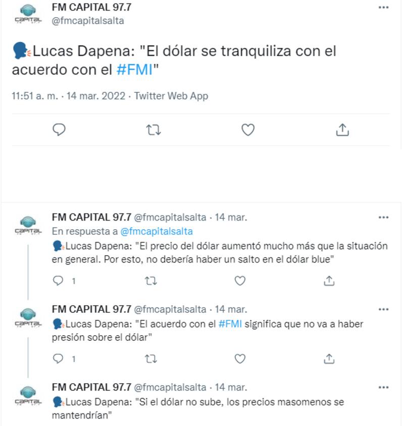 "El dólar se tranquiliza con el acuerdo con el FMI", sin embargo, "ahora en la Argentina tenemos la suba de precios nuestra y aparte lo que genera la situación del exterior. No está claro de cuánto puede ser la suba por las noticias internacionales", explicó.