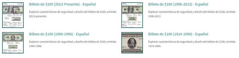 El Programa de Educación sobre la Moneda de los Estados Unidos (CEP, por sus siglas en inglés) da cuenta de 4 estilos de diseños de billetes de U$S 100 de circulación válida actual: