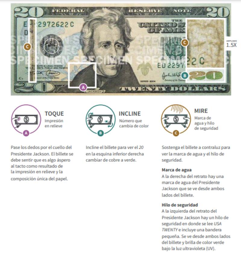El billete de u$s 20 presenta colores de fondo sutiles en verde y durazno e incluye también un hilo de seguridad incrustado que brilla cuando es iluminado con luz ultravioleta.