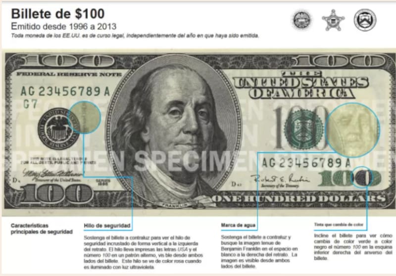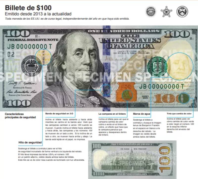 Banda de seguridad en 3-D: incliná el billete hacia adelante y hacia atrás mientras se centra en la banda azul. Vas a ver que las campanas cambian a varios 100 cuando se mueven. Además cuando inclinas el billete hacia adelante y hacia atrás, las campanas y los números 100 se mueven de un lado a otro, mientras que si lo inclinas de un lado a otro, se mueven hacia arriba y abajo. La banda está tejida en el papel, no impresa.