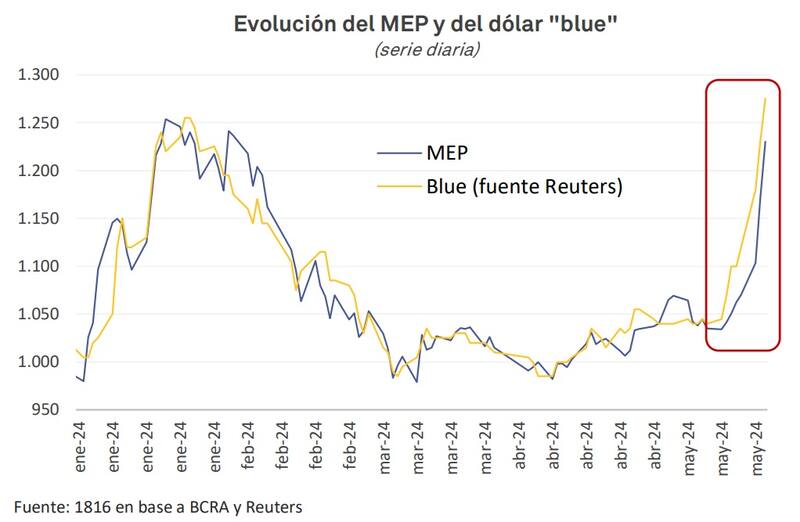 Además, el precio del dólar informal se adelantó a la suba del MEP y CCL, por lo que infieren que la disparada del blue, quizá más sensible a las tasas de los depósitos a plazo fijo y a las tensiones políticas, generó mayor demanda de los inversores minoristas en el MEP, lo cual se retroalimentó en las ruedas siguientes.