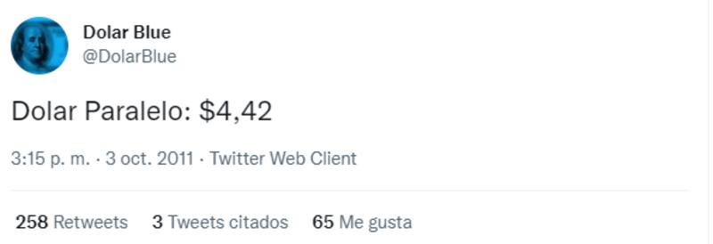 "Dolar Paralelo: $4,42", publicó hace más de 10 años atrás el perfil @DólarBlue en Twitter.