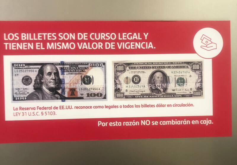 "Los billetes son de curso legal y tienen el mismo valor de vigencia. La Reserva Federal de EE.UU. reconoce como legales a todos los billetes de dólar en circulación. LEY 31.U.S.C 5103. Por esta razón NO se cambiarán en caja", señala la cartelería bancaria.