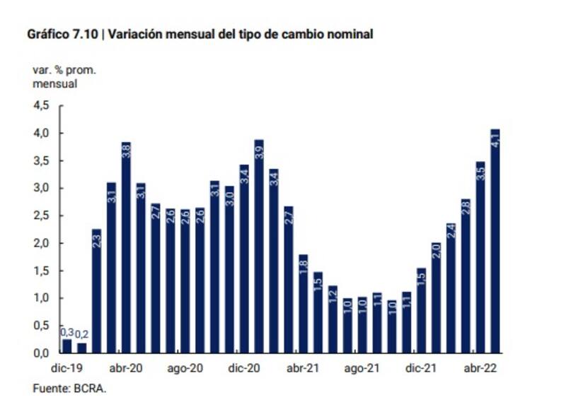 En este punto, el BCRA adelantó que continuará "readecuando gradualmente la tasa de variación del tipo de cambio nominal a un ritmo acorde con la inflación doméstica", por lo que se espera una aceleración de la devaluación en los próximos meses.