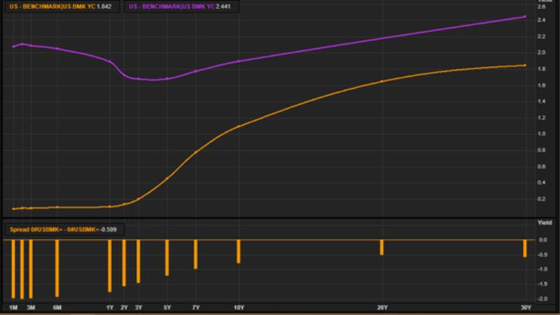 Actualmente la curva se encuentra con una pendiente positiva en todos los tramos, con las tasas debajo del 0,2% hasta los vencimientos a 3 años y niveles de 1,85% en el extremo mas largo de la curva.