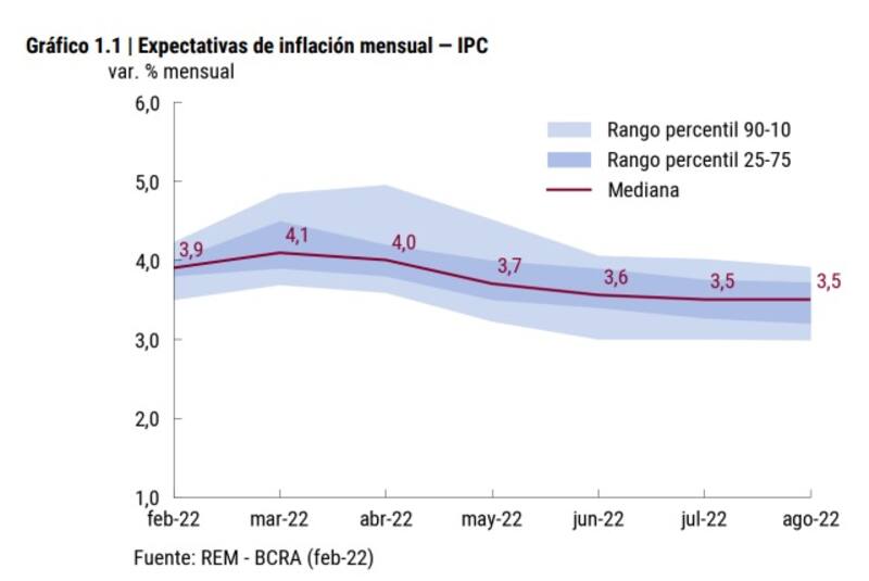 Incluso en marzo y abril, los analistas prevén que superará el 4%. "Las variaciones esperadas para los meses de marzo y abril se mantienen por encima de dichos valores, para luego converger hacia un 3,5% mensual en los meses de julio y agosto", destacó el Central.