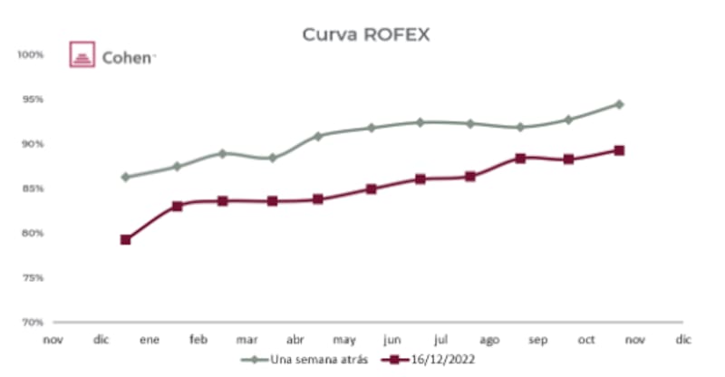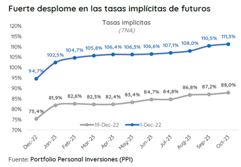 Sin embargo, actualmente, la curva Rofex opera con tasas de 75% de TNA en el tramo más corto, y saltando a tasas del 82% (TNA) promedio de enero a mayo y del 85% de TNA en promedio de mayo a octubre de 2023.