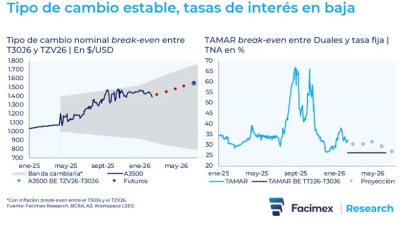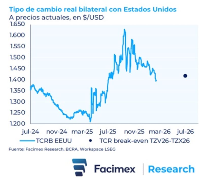 “Al cierre de la semana, el tipo de cambio real bilateral break-even entre el Boncer de junio (TZX26) y el Bonte de junio (TZV26) anticipaba una depreciación real del peso de 1,8% hacia mitad de año, tomando como referencia una inflación break-even a un año de 3,37% para Estados Unidos. Es una proyección que contrasta, si bien no tan demasiado, con nuestro escenario base; que descuenta una leve apreciación hacia mitad de año”, detalló.