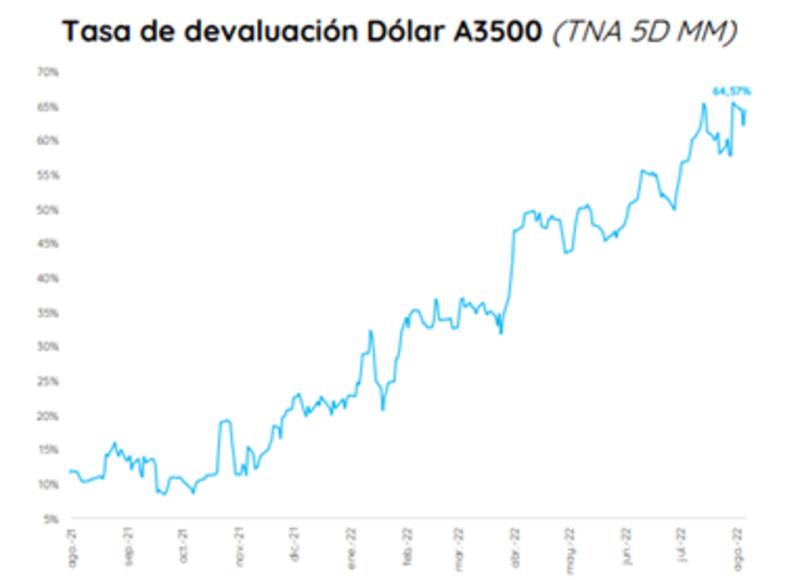 Tomando la tasa de devaluación del tipo de cambio oficial promedio en los últimos cinco días, la tasa de devaluación saltó al 65% de TNA.