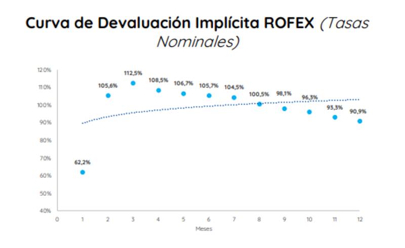 Sin embargo, en la última semana, el mercado de dólar futuro se volvió a recalentar y al cierre del viernes la gran mayoría de la curva cerró con tasas de devaluación implícitas en la curva por encima del 100%.