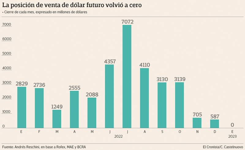 La reducción a cero la hizo desde los casi u$s 590 millones en posición de venta con los que había iniciado el año. El dato contrasta, además, con los u$s 7000 millones que registraba en ventas en julio del año pasado, en medio de las fuertes tensiones tras las salidas de Martín Guzmán y Silvina Batakis de la conducción del Ministerio de Economía.
