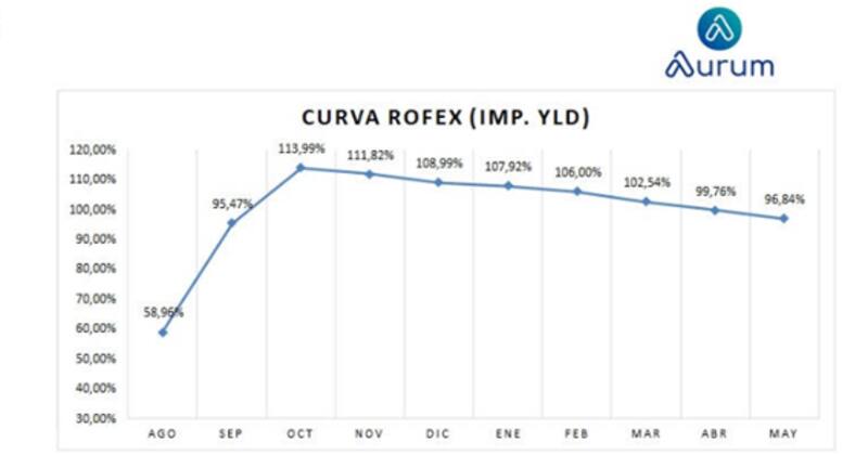 Si bien la expectativa se redujo en el margen para agosto, mirando a septiembre y hacia los próximos meses, las tasas implícitas de devaluación en la curva de Rofex se ubican en niveles de 95% a septiembre y de 114% a octubre.