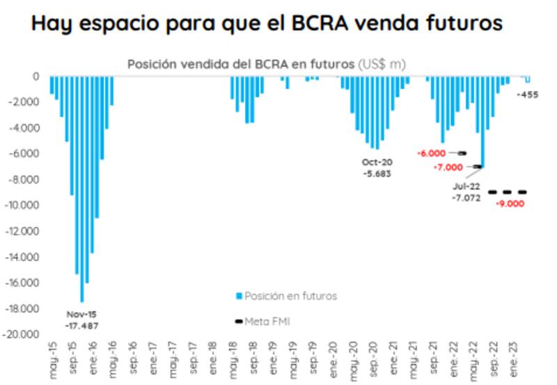 Todavía el BCRA tiene espacio para intervenir en el mercado de dólar futuro ya que su posición vendida es de -u$s 455 millones, es decir, un monto muy bajo en relación al límite que encuentra en Rofex y MAE por un total de u$s 9000 millones.
