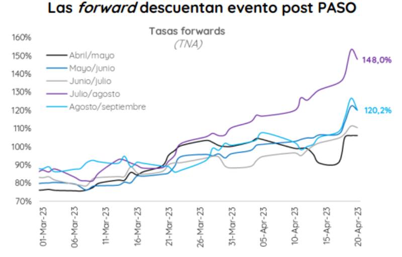 "Al mirar el comportamiento de las tasas forward, la de julio y agosto se desmarcaron marcadamente de sus pares. En consecuencia, el mercado descuenta algún tipo de evento post PASO", comentaron.