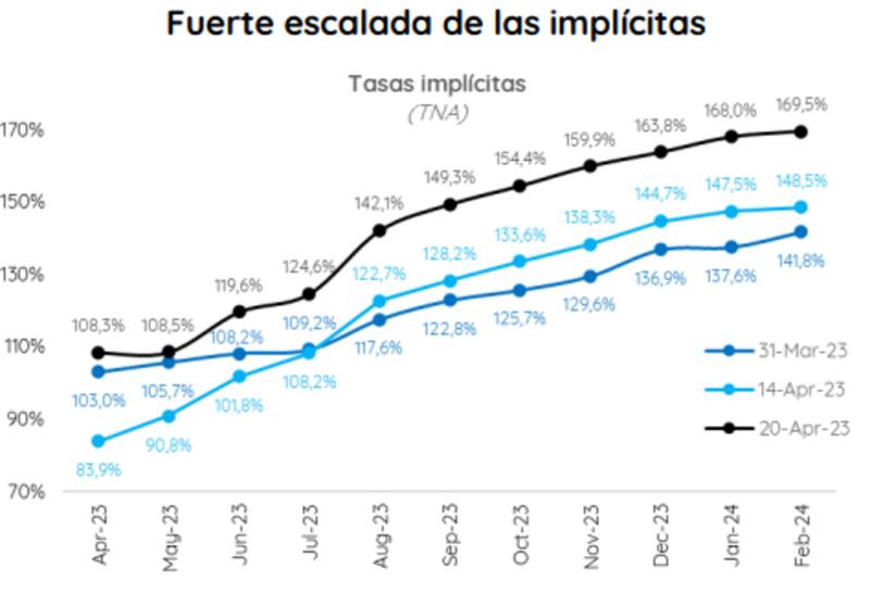 Sin embargo, actualmente, los plazos más cortos operan con tasas de 108% en el extremo más corto, subiendo a 145% a agosto y en 170% en febrero de 2024.
