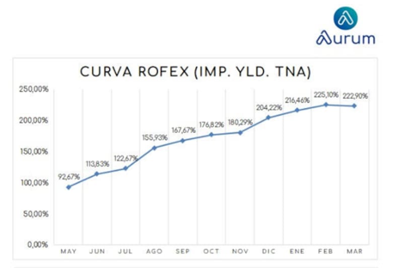 Las tasas de devaluación implícita en Rofex se ubican en niveles de 114% para junio, saltan a 123% a julio. Luego vuelven a pegar un salto discreto mayor al 156% en agosto.