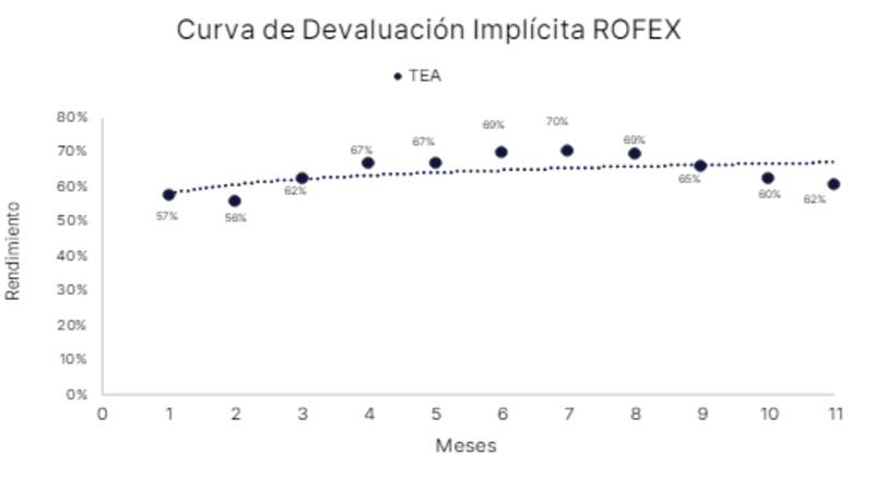 Las tasas de devaluación esperadas en Rofex rondan el 57% (TEA) para el tramo más corto, saltando al 70% en el tramo medio y regresando a niveles de 60% en el tramo más largo.