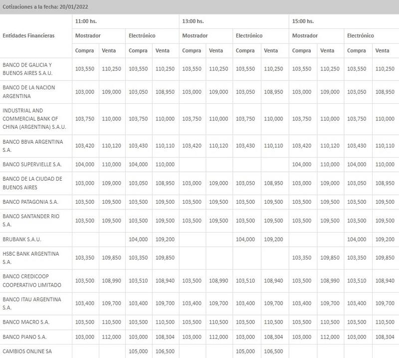 En tanto, cerró en $ 103,39 para la compra y en $ 109,71 para la venta en el promedio de las entidades financieras que releva el Banco Central (BCRA), mostrando otro leve avance en relación a la rueda previa.