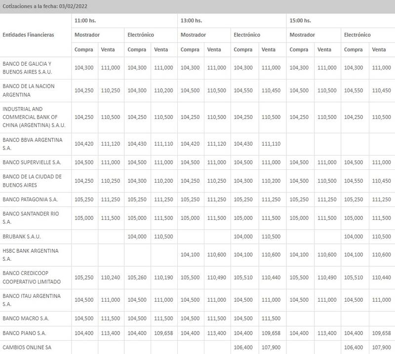 En tanto, cerró en $ 104,61 para la compra y en $ 110,91 para la venta en el promedio de las entidades financieras que releva el Banco Central (BCRA), con lo cual mostró otro avance en relación a la rueda previa.