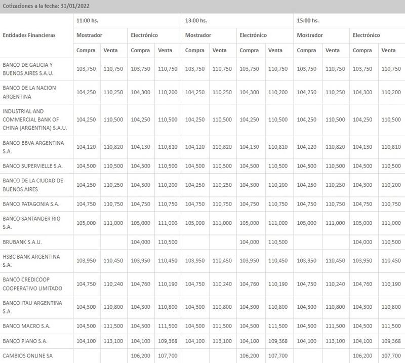 En tanto, cerró en $ 104,34 para la compra y en $ 110,71 para la venta en el promedio de las entidades financieras que releva el Banco Central (BCRA), con lo cual mostró otro leve avance en relación a la rueda previa.
