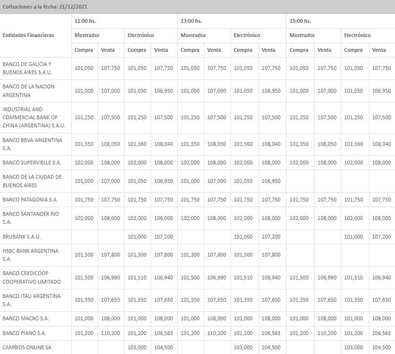 En tanto, cerró en $ 101,38 para la compra y en $ 107,72 para la venta en el promedio de las entidades financieras que releva el Banco Central (BCRA), mostrando otro leve avance respecto al cierre anterior.