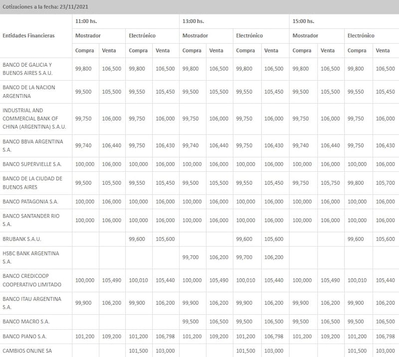 En tanto, cerró en $ 99,78 para la compra y en $ 106,09 para la venta en el promedio de las entidades financieras que releva el Banco Central (BCRA), mostrando otro leve avance en relación al cierre previo.