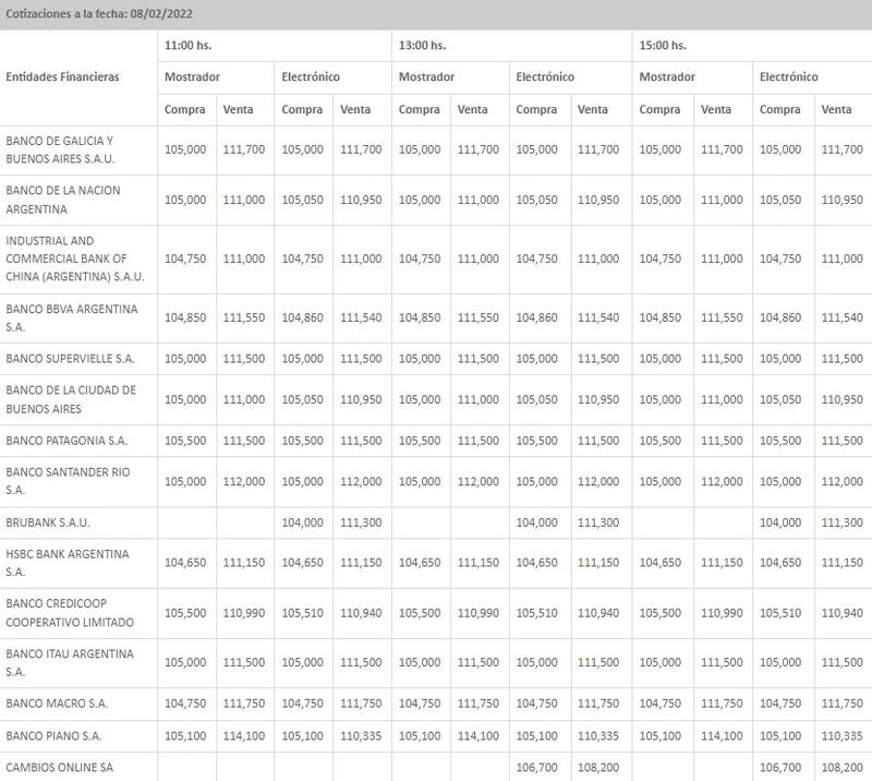 En tanto, cerró en $ 104,96 para la compra y en $ 111,48 para la venta en el promedio de las entidades financieras que releva el Banco Central (BCRA), con lo cual mostró otro leve avance en relación a la rueda previa.