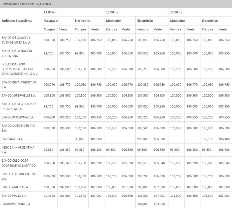 En tanto, cerró en $ 100,17 para la compra y en $ 106,48 para la venta en el promedio de las entidades financieras que releva el Banco Central (BCRA), mostrando otro avance en relación al cierre previo.