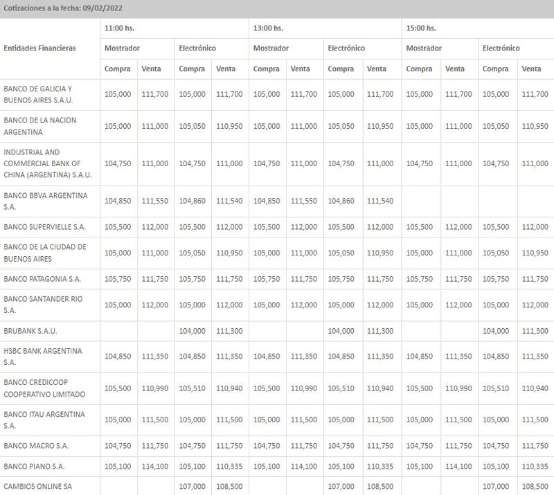 En tanto, cerró en $ 105 para la compra y en $ 111,51 para la venta en el promedio de las entidades financieras que releva el Banco Central (BCRA), con lo cual mostró otra leve suba en relación a la rueda previa.