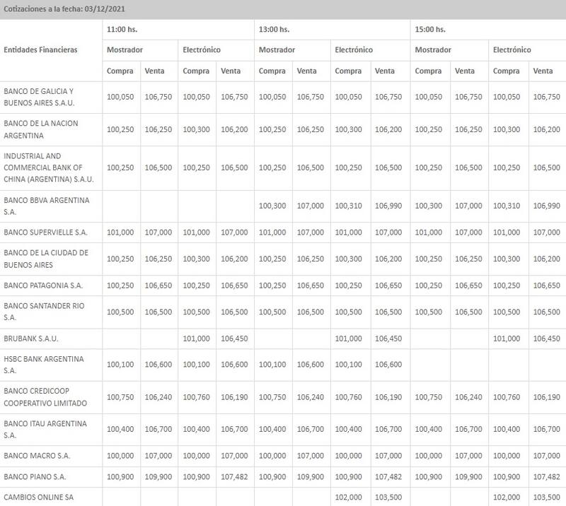 En tanto, cerró en $ 100,29 para la compra y en $ 106,62 para la venta en el promedio de las entidades financieras que releva el Banco Central (BCRA), mostrando otro leve avance en relación al cierre previo.