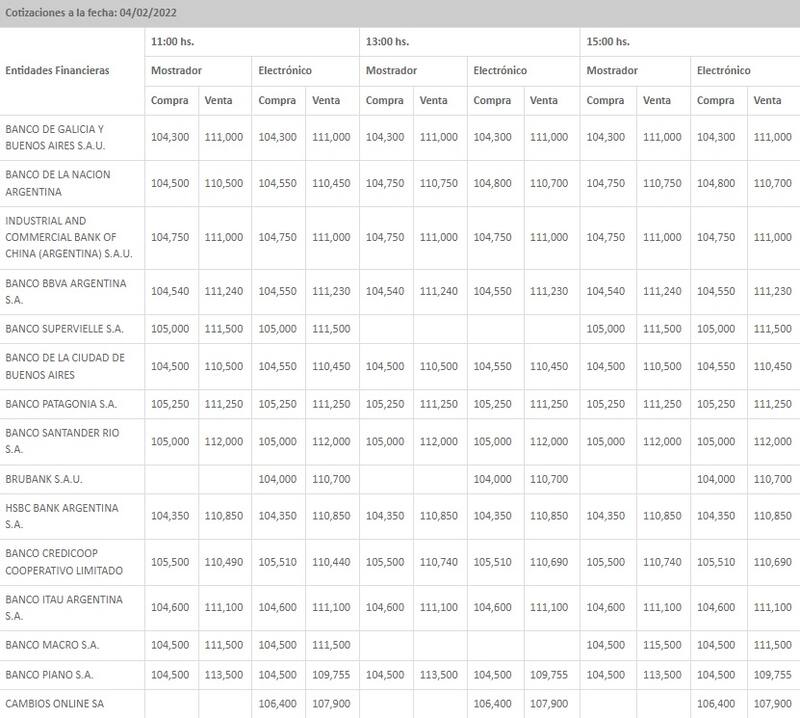 En tanto, cerró en $ 104,68 para la compra y en $ 111,36 para la venta en el promedio de las entidades financieras que releva el Banco Central (BCRA), con lo cual registró otro leve avance en relación a la rueda previa.