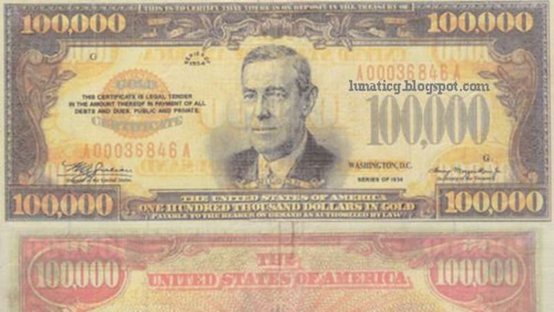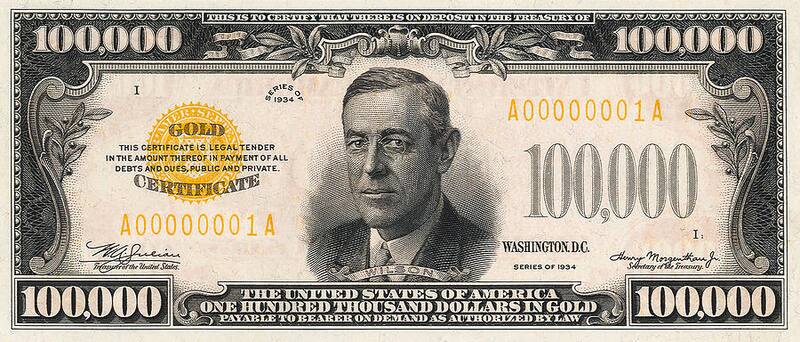 El billete más grande impreso por la Oficina de Grabado e Impresión fue el Certificado de Oro de u$s 100.000, serie 1934, cuya vigencia se mantuvo hasta el 9 de enero de 1935 y fueron emitidos por el Tesoro de los Estados Unidos a los Bancos de la Reserva Federal ( Fed por su siglas en inglés).