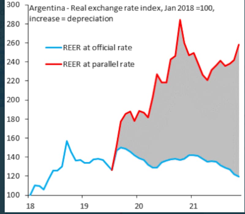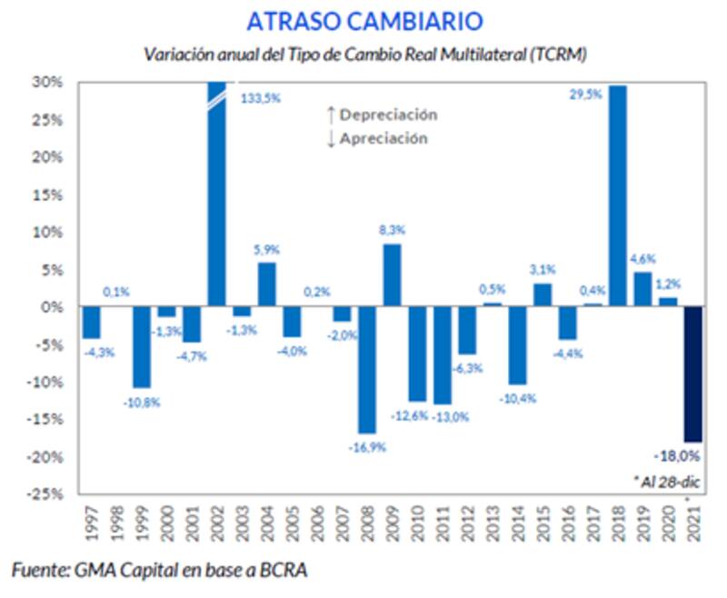 Nery Persichini, head de estrategia de GMA Capital explicó que en 2021 la dinámica inflacionaria de más de 50% maridó con un menor ritmo de actualización del tipo de cambio oficial.