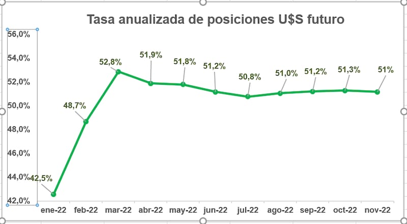 Según Di Stefano, quien había anticipado un blue a $ 220 para el primer mes de este 2022, de febrero a marzo la tasa anualizada de posiciones del dólar futuro pasará del 48,7% al 52,8%, a un ritmo de casi 4 puntos. Luego, durante en lo que resta del año, el indicador se mantendrá por encima del 50%.