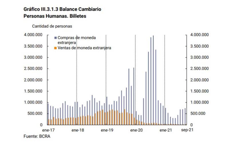 Según reflejó el último Informe de la Evolución del Mercado de Cambios y Balance Cambiario, publicado el viernes último, 746.000 personas compraron dólares en los bancos durante el mes de septiembre. Fueron unas 50.000 personas más respecto de quienes habían hecho lo propio en agosto, mes en el que la cantidad de "personas humanas" que utilizaron su cupo de u$s 200 había ascendido a 697.000. Antes, se habían registrado compras por parte de 690.000 personas en julio, y 443.000 en junio.