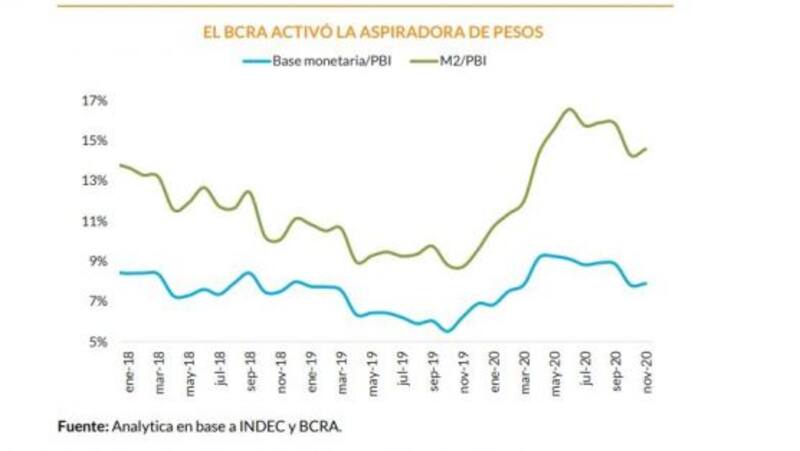 Afirma Anaytica que "el BCRA necesita llevar de forma sostenida la base monetaria a $ 2,6 billones y el M2 a $ 4,6 billones". Y en ese sentido, señala: "La diferencia entre ambos agregados está explicada por la expansión secundaria de dinero, que se regula a través de los encajes. Si no se modifican, el nivel de M2 no puede mantenerse por debajo de $ 4,7 billones".
