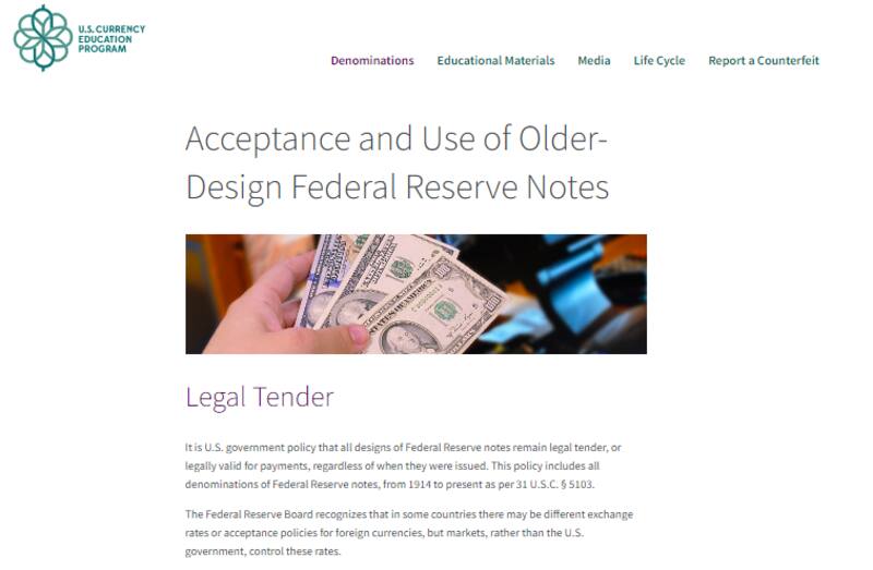 "Es política del gobierno de los Estados Unidos (EE.UU.) que todos los diseños de billetes de la Reserva Federal sigan siendo de curso legal o legalmente válidos para pagos, independientemente de cuándo se hayan emitido. Esta política incluye todas las denominaciones de billetes de la Reserva Federal, desde 1914 hasta el presente según 31 USC § 5103", indica el artículo en su primer párrafo.